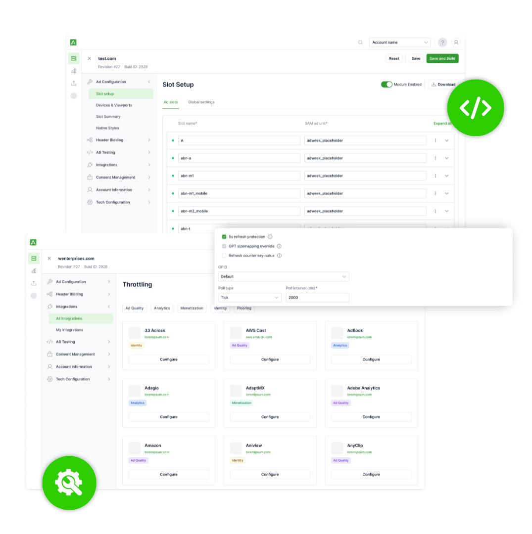 With the Cloud Wrapper's UI, ad ops teams can make real-time updates to ad setups, partners, layouts, and custom scripts—no developer required. Manage your entire on-page ad tech stack through an intuitive interface designed to streamline operations and scale efficiently.